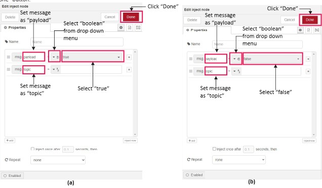 - Now double click on second “inject” node, Select “false” from the drop down menu (Refer Figure 3(b) node settings),Finally click “Done” button.