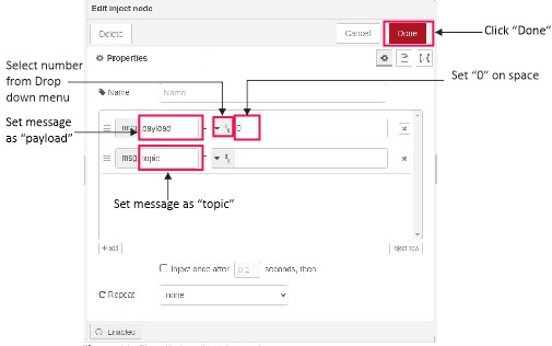 - Double click on one “inject” node, change the node settings according to Figure 4, Click “Done” button.