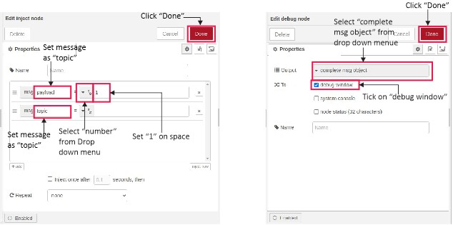 - Apply same process on other “inject” node, “debug” node (Follow Figure 5), Click “Done” button.